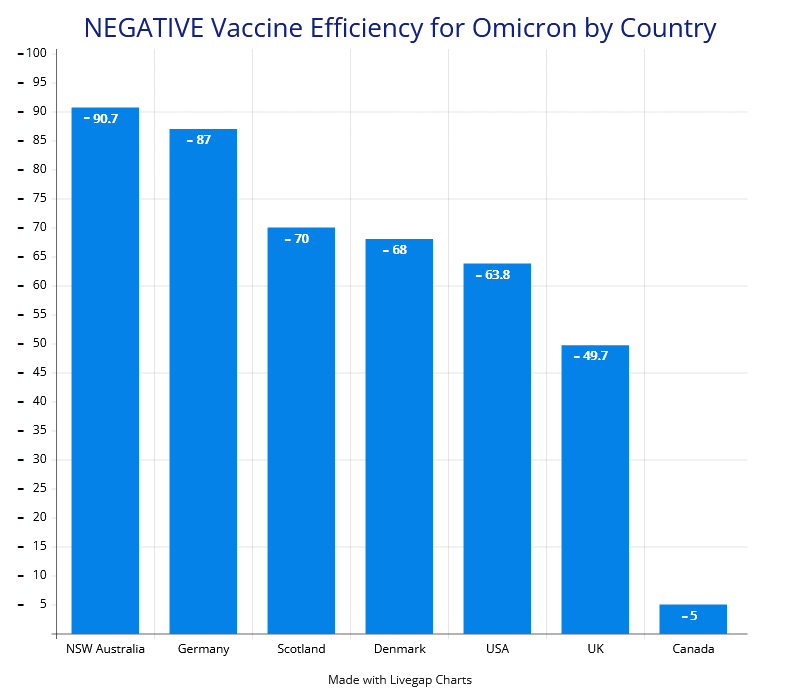 All Covid vaccines drop in effectiveness persistently and inexorably until -99% (where case rates in the fully vaccinated are 100x greater than case rates in the unvaxxed - NSW in Australia has already reached 10x). Then they continue to approach 100% presumably, where case rates are hundreds and then thousands of times greater in the vaxxed than in the unvaxxed. Therefore all Covid vaccines progressively damage, degrade and destroy your immune system resulting in more infections, longer recovery times from infection and finally in sepsis (no recovery from infection without massive medical intervention).