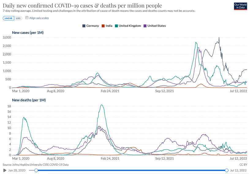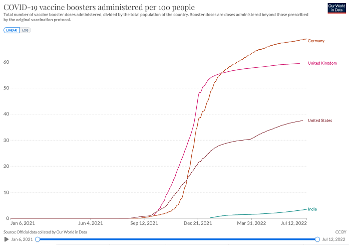 India has had the slowest vaccination campaign and has only just started at the boosters. It has by far the fewest cases and deaths per million despite being the home of the Delta variant. Whereas Germany, with the highest booster take up, has the highest case rate and until recently the highest death rate too.