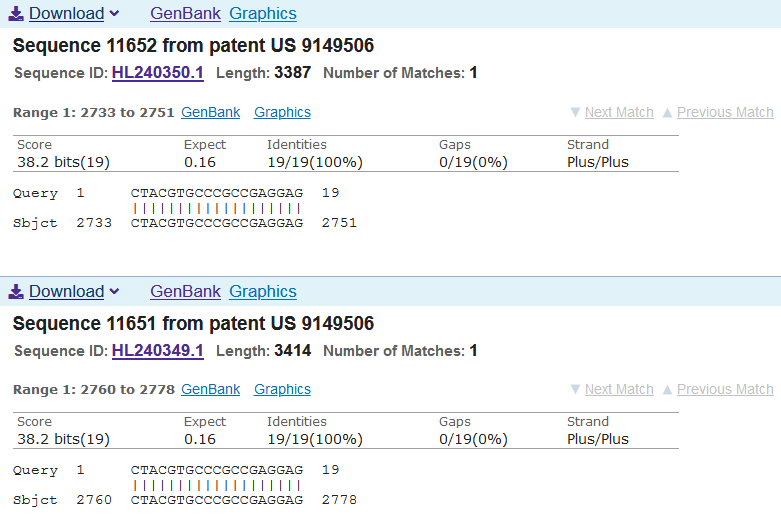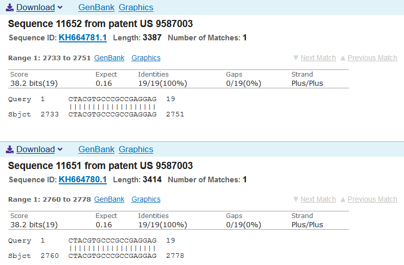 I decided to check their work. Yes. I fact checked them (I will send an invoice to the globalists). This turned out to be a bit of an epic journey. The Google patent page for US9587003B2 does not contain the gene sequence. The pdf of the patent does not contain the gene sequence and is not searchable from pages 101-304. But it does have a link to a lengthy 'Sequence Listing" section which link one cannot copy. So I manually transcribed it in my fair hand - http://seqdata.uspto.gov/?pageRequest=docDetail&DocID=US09587003B2