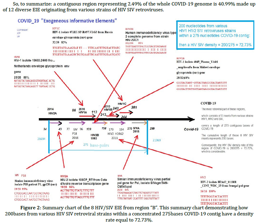 Prof Luc Montagnier, before he died on 2022February8, did a total assassination of the concept that Covid-19 evolved naturally by showing that it had massive equivalence to HIV. The diagram below shows a 275 nucleotide region of Covid-19 which has 200 nucleotides from HIV/SIV (Simian ImmunoVirus) in it. And remember there are 61 codons specifying 20 amino acids. So one can say the same thing in on average 3 different ways with codons. You can download a pdf of his study here and the supplementary materials here. It is very technical. But he did win the Nobel prize for discovering the HIV virus. So if anyone would know if Covid had been boosted with HIV, it would be him. He pointed out that Covid-19 was man made early in the pandemic and was himself assassinated by the press and the fact checkers as a result. Every single fact checker who attacked him was wrong. There was no scientific basis to any of their fact checking. These outfits are not fact checkers at all of course. They are globalist disinformation agencies, sons of Goebbels, fact chuckers and science deniers. They are about as trustworthy as an American election. I can check a fact for myself thank you very much. I don't need a brainwashed woke madrassa student telling me their opinion about a subject that they never studied at University.
